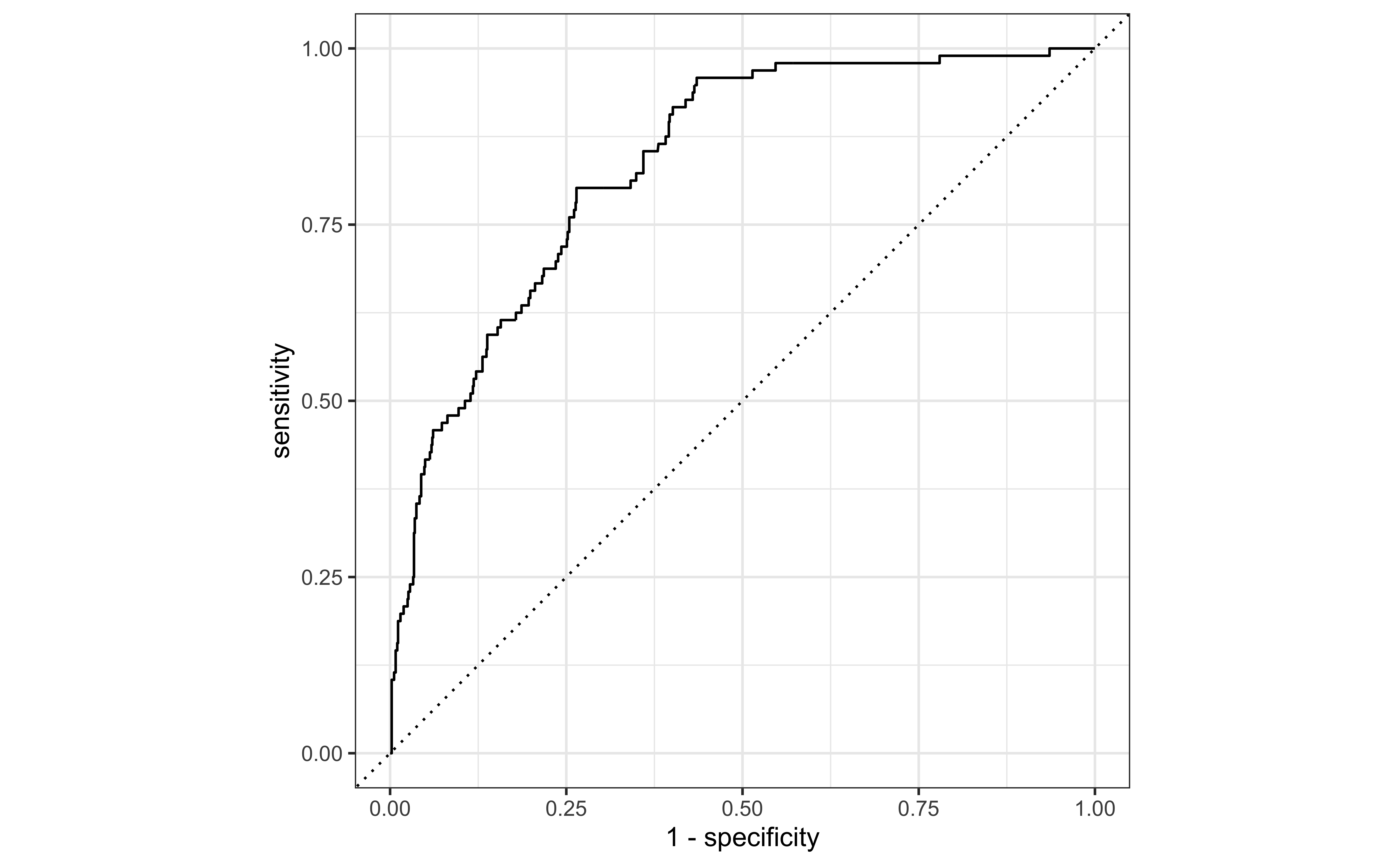 Receiver operating characteristic (ROC) curve+ plots the true positive rate (sensitivity) vs. false positive rate (1 - specificity).