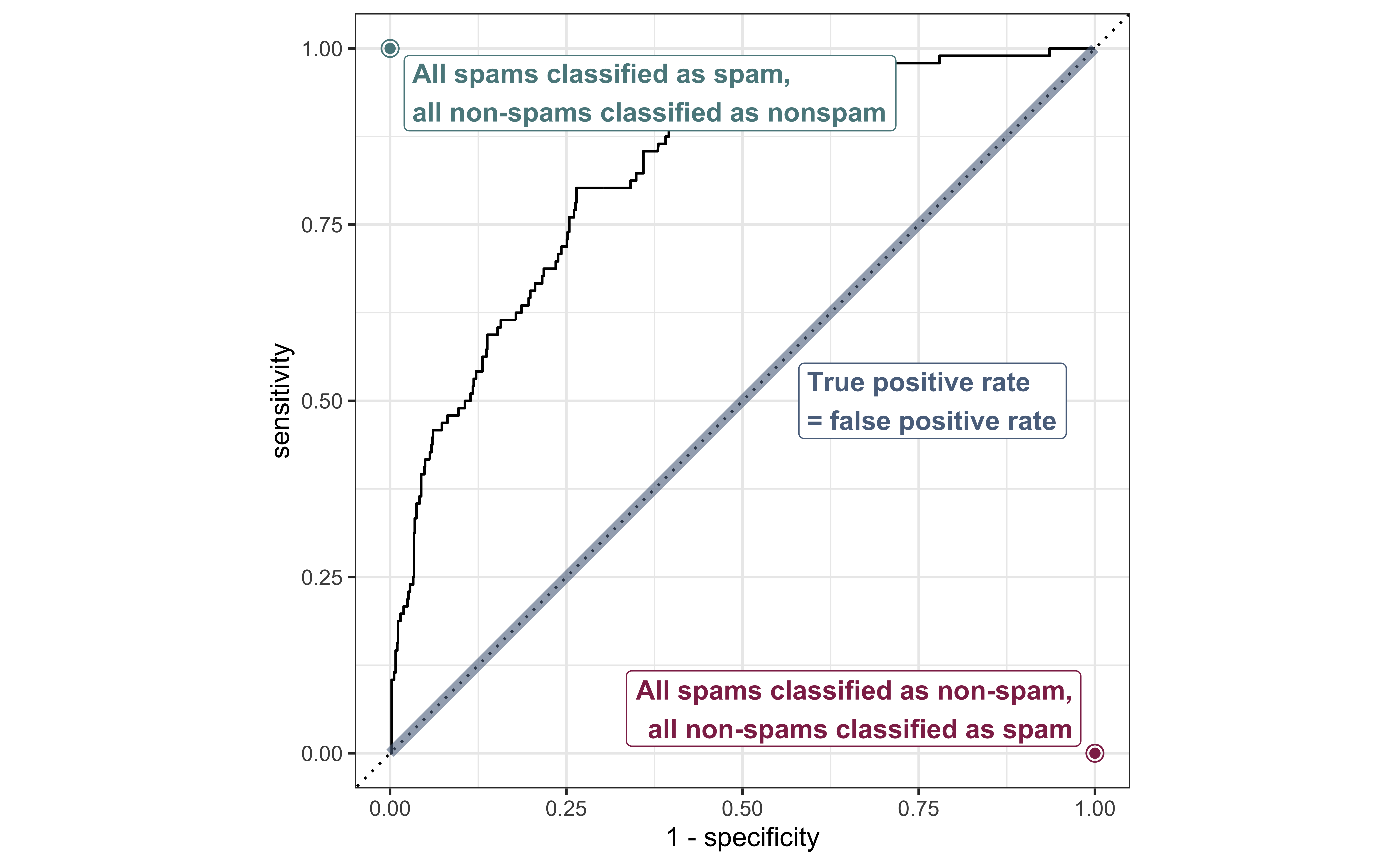 kable(col.names = c("", "Email is not spam", "Email is spam"))Use the ROC curve to determine the best cutoff probability